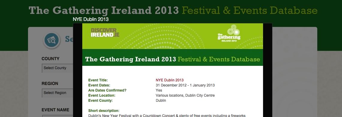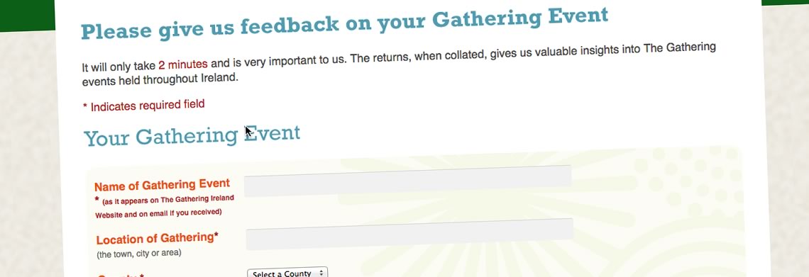 The client challenge was to design a survey type application to facilitate and capture feedback from the Gathering event organisers throughout Ireland. The content editors could then review the data that was submitted and add extra tagging to make searching and filtering the feedback easier. The online system allowed real-time analysis of the returning data and the generation of reports by those with log-in permission.